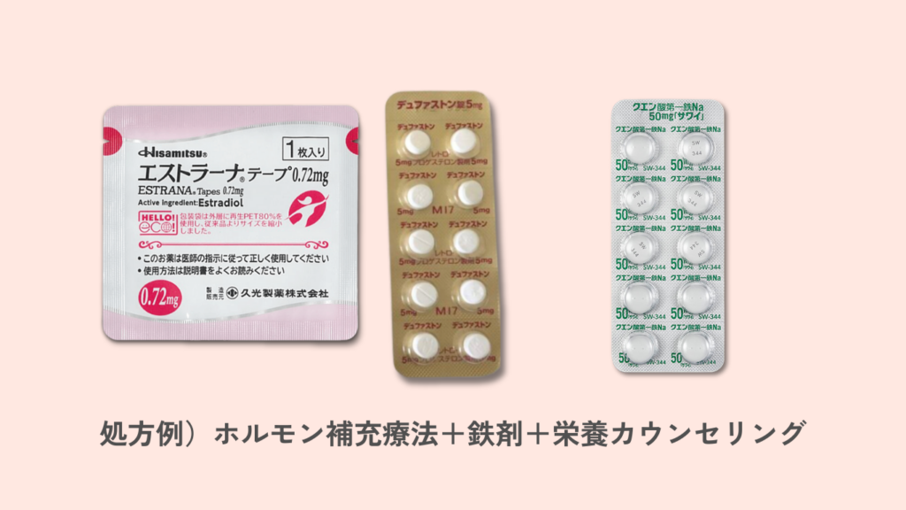 減少した女性ホルモンを補填するために、ホルモン補充療法を処方。それに加えて栄養不足を解消するための鉄剤の処方と、根本的な食事改善が必要なため栄養指導カウンセリングを実施。
